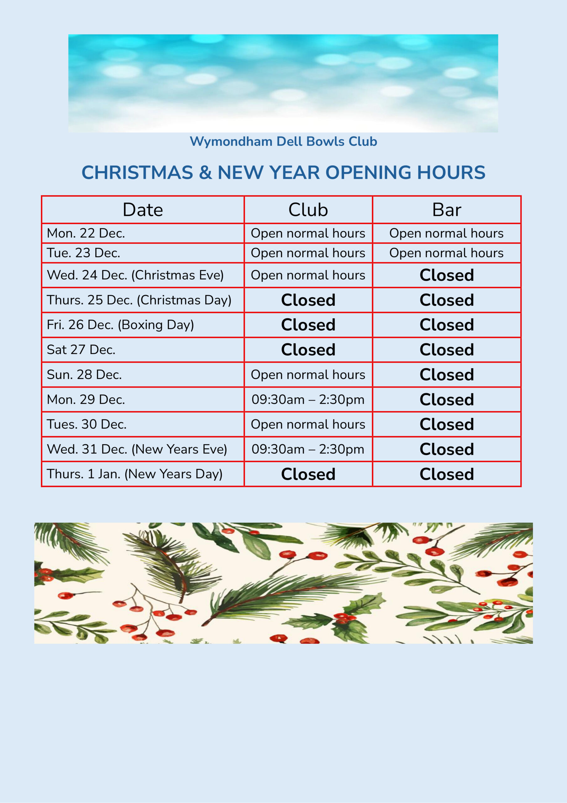 Men's Norfolk Bowls Association - The Men's AGM followed by the County AGM is to be held on Sunday 7th December 2025. All documentation can be found on the notice board in the Outdoor Veranda.